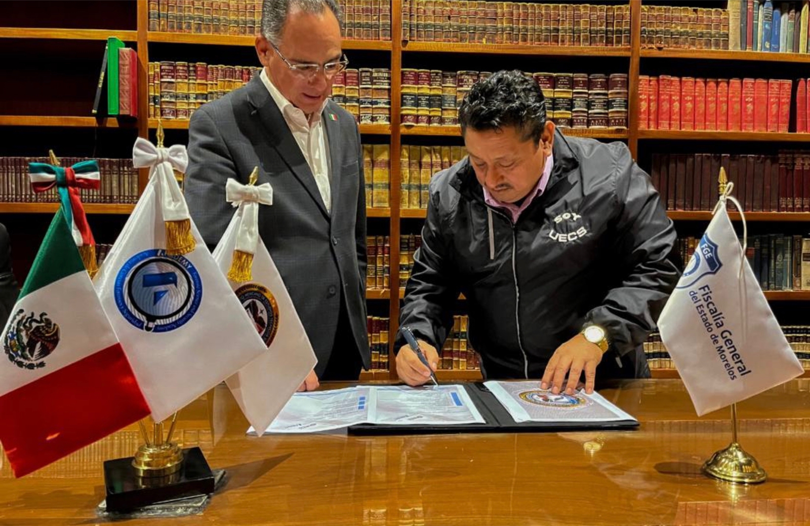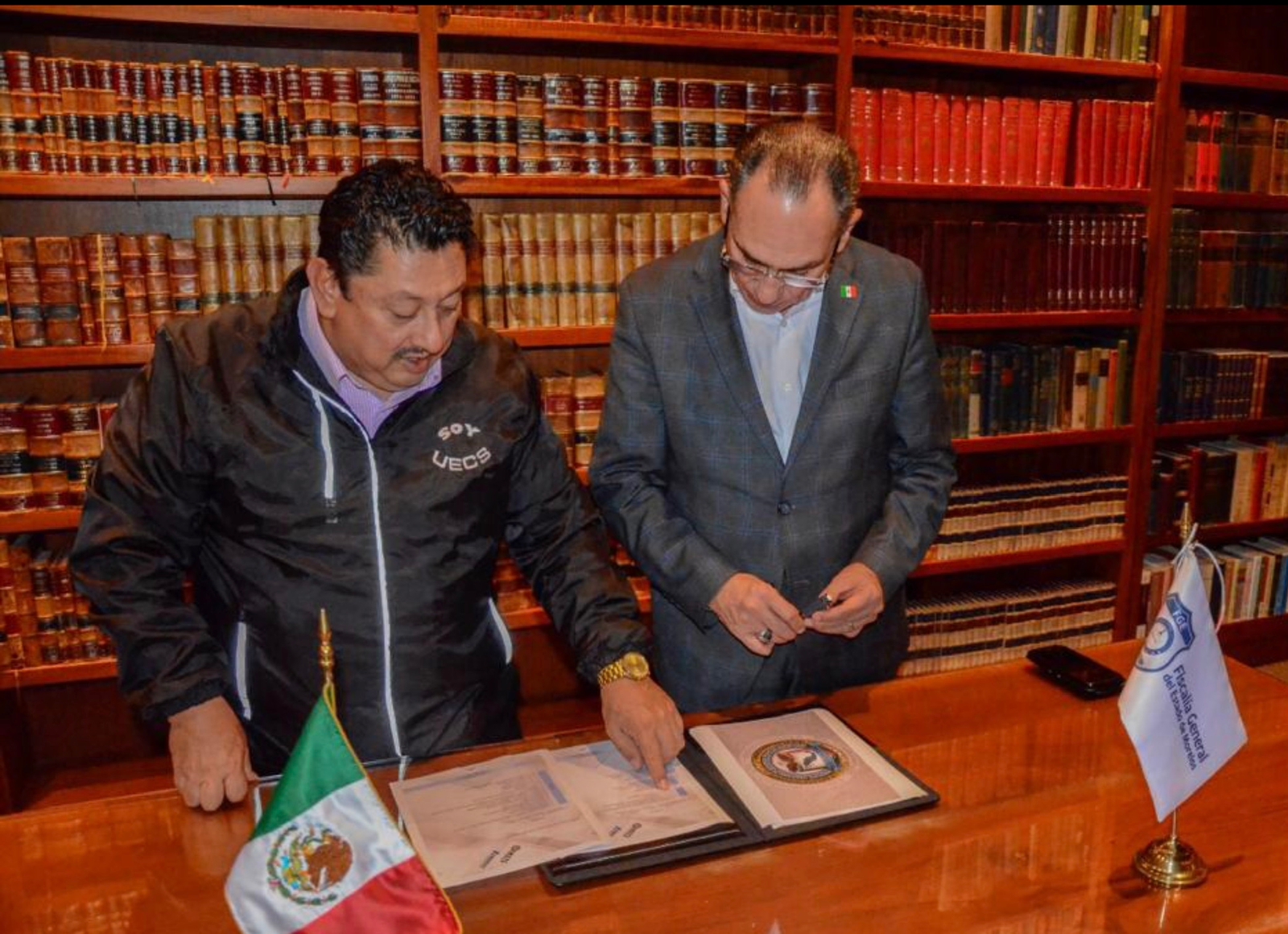 Al continuar con los procesos de fortalecimiento y profesionalización del personal de atención y operativo de la Fiscalía General del Estado, su titular Uriel Carmona Gándara firmó con Cesáreo Carvajal Guajardo, rector institucional del Instituto Mexicano de Estudios Técnicos Superiores en Defensa, Seguridad Nacional, Servicios Periciales y Procuración de Justicia (IMETS) y de la Academia de Ciencias Forenses (AFODEMY), convenio de colaboración para la realización de cursos especializados.